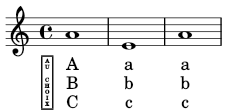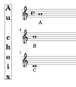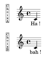 _\markup\CaseChoix e' a' \break } \addlyrics { A a a } \addlyrics { B