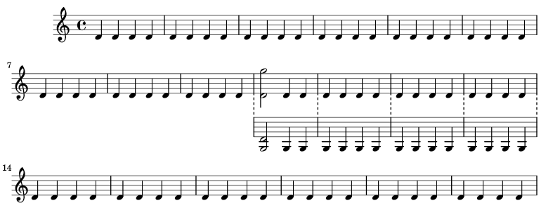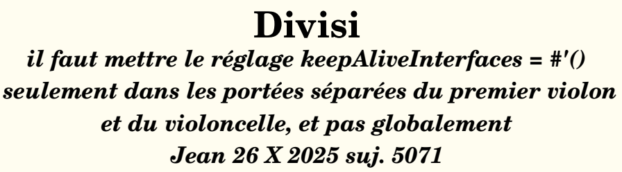 Et les \unset Staff.keepAliveInterfaces et \set Staff.keepAliveInterfaces = #'() permettent juste de dire "ici c'est divisi (différentes portées)" ou "ici c'est unison (une seule portée)" et LilyPond se charge de compléter les débuts et fins de ligne avant et après le passage divisi.