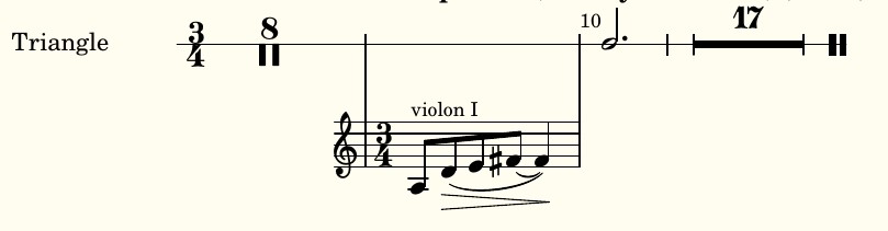 Pour imprimer une citation avec portée (ici le violon) sur une ligne de percussion, j'ai bricolé, mais mal ! Je vous livre le code compilable, en réclamant votre indulgence. J'ai fait plusieurs essais infructueux avec les contextes donnés par Jean.