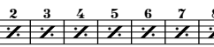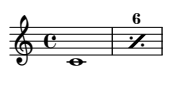 Or si j'obtiens facilement une mesure avec le signe % (avec la fonction \makepercent trouvée dans le manuel de notation), impossible de placer le chiffre 6 au dessus. J'ai beau m'y prendre de toutes les façons (\textmark, \markup etc ...) je n'obtiens rien.